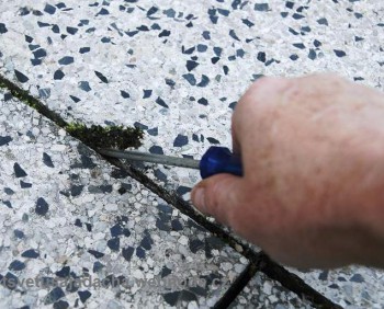Швы между плитами террасы, положенными насухо, со временем загрязняются. Туда кроме пыли и грязи попадают семена растений. Если хотя бы раз в год превентивно не вычистить террасу сильной струей воды, приходится ее разбирать.