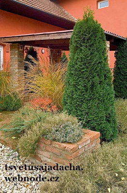 Около дома находится крытый кирпичный дворик - патио с красивыми клумбами, где при минимальном уходе процветают золотистый мискантус (Miscanthus sinensis), низкий барбарис (Berberis thunbergii), полуопадающая жимолость (Lonicera nitida), вечнозеленый пиерис (Pieris japonica) и бересклет (Euonymus fortunei) Emerald Gaiety.
