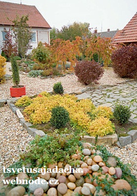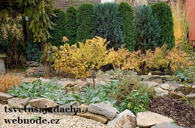 Серебро, золото, изумруды. Хотя чистец на переднем плане и туи и кипарисовники в живой изгороди сохраняют цвет круглый год, спиреи и гортензии в центре переодеваются в желтые одежды в холодну погоду.