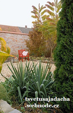 Магнолия в такую погоду приобретает оттенок карамели. Около нее стоит стул, с которого прекрасный вид на быстро растущий смакс оленерогий (Rhus typhina) и на прилегающие клумбы с юккой.