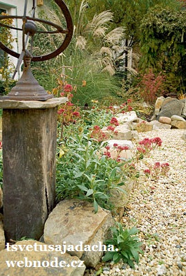 Многолетние растения на клумбах между дорожками, посыпанными гравием, выделяются главное летом. Несколько поздних, как, например, эхинацея (Echinacea), золотая розга (Solidago), кентрантус красный (Centranthus ruber), мордовник (Echinops ritro), и даже однолетняя эшшольция (Eschscholzia californica), здесь цветут до самых морозов.