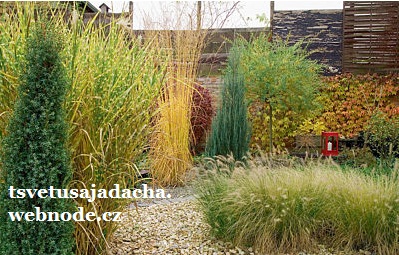 Кроме можжевельника и ивы на ветру шумят декоративные травы - мискантус, пожелтевшая молиния и низкая бледнеющий пеннисетум. Стену украшает девичий виноград