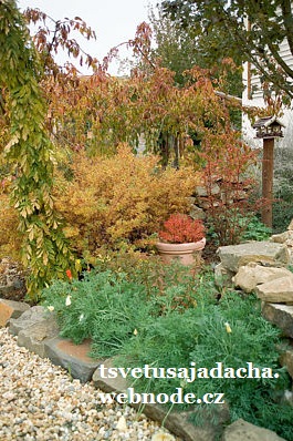 Посадка этажами создает хороший вид каждого растения: самые высокпие - сакуры, перед ними растет широкая полоса лапчатки а впереди зеленеет эшшольция. на месте отцветшего растения поставлен горшок с барбарисом.